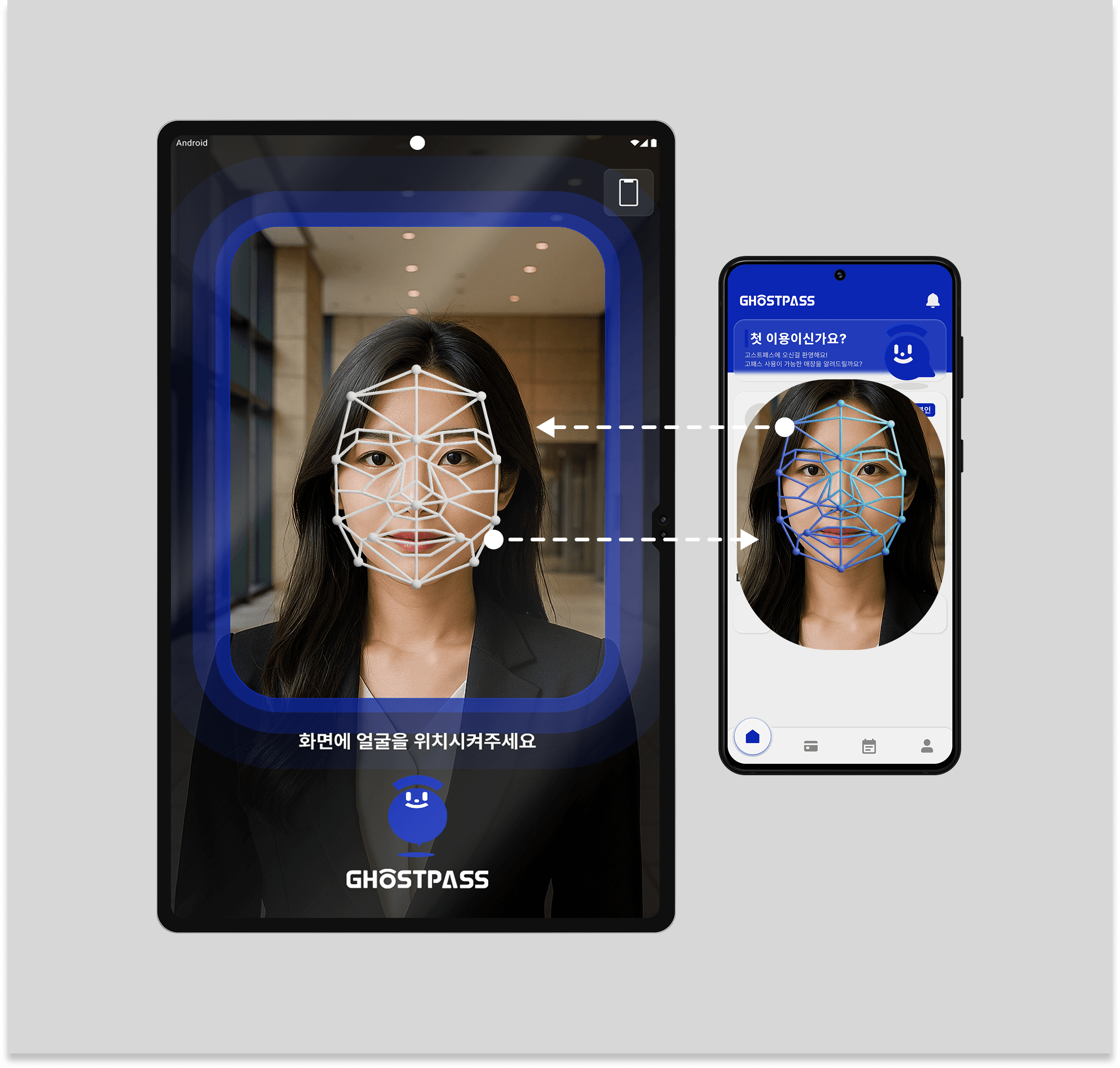 사용자 단말기와 안면인식 단말기 간 실시간으로 비콘통신을 연결합니다.